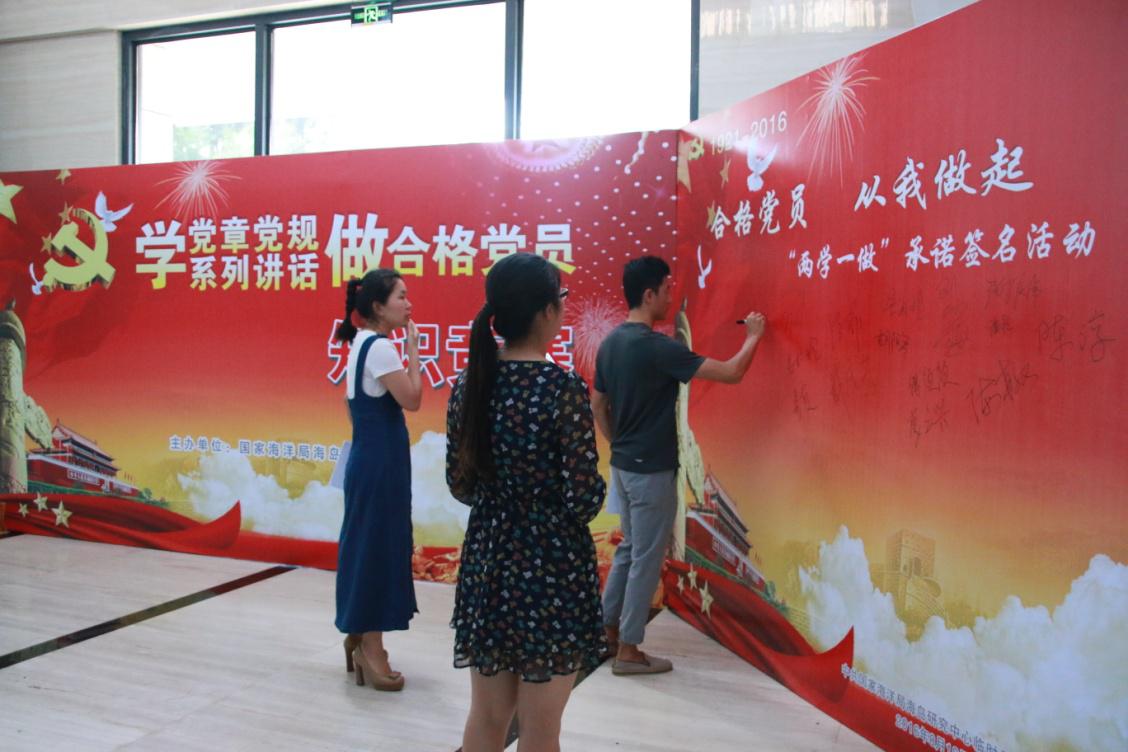 图三:中心党员在“合格党员 从我做起”承诺书的展板前依次签名