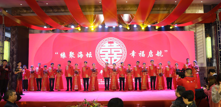 11对新人身着中式喜服,在移风易俗倡议签名墙以及婚书上签。走过幸福门,来到舞台上,新人们集体亮相,并宣读结婚誓词,行三拜礼仪。参加此次集体婚礼的11对新人中,既有扎根基层一线的年轻干部,也有默默耕耘在三尺讲台的人民教师,还有奋斗在企业、机关团体的优秀青年。