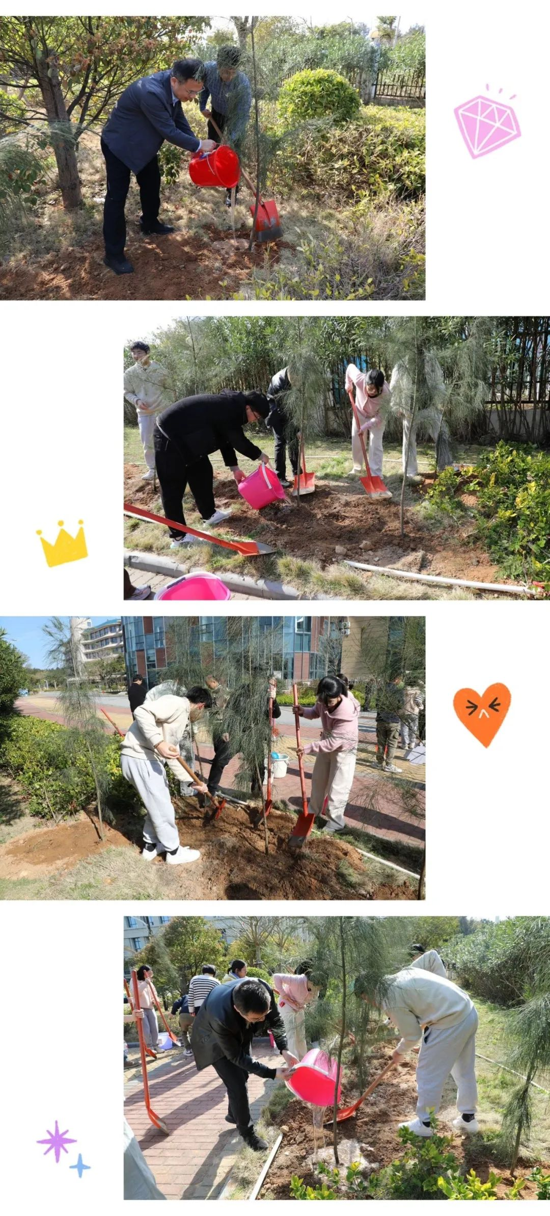 活动现场,大家热情高涨、鼓足干劲,以党、团支部为单元,分工协作、互相配合,有的挥锹铲土,有的扶树培土,有的提桶浇水,十分细致认真。在大家的共同努力下,一株株新栽下的树苗迎风挺立,在春日下焕发出勃勃生机和绿色希望。