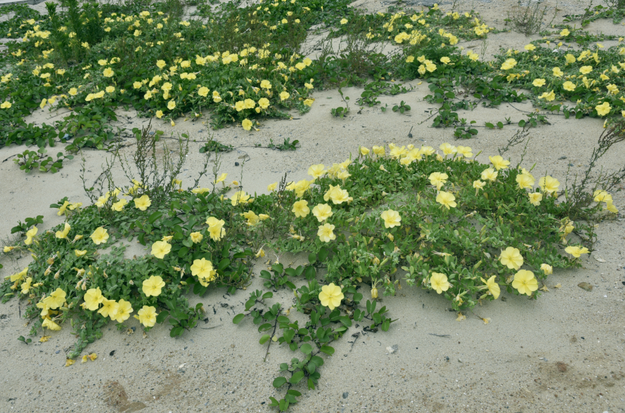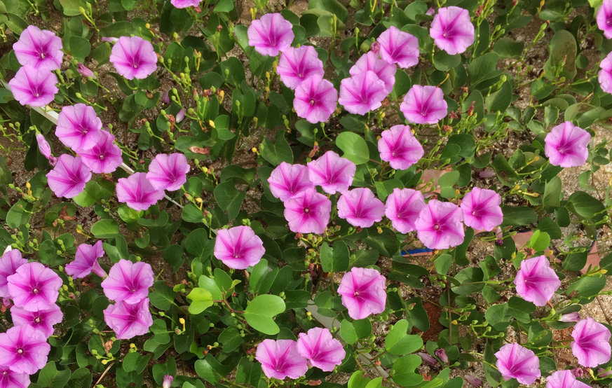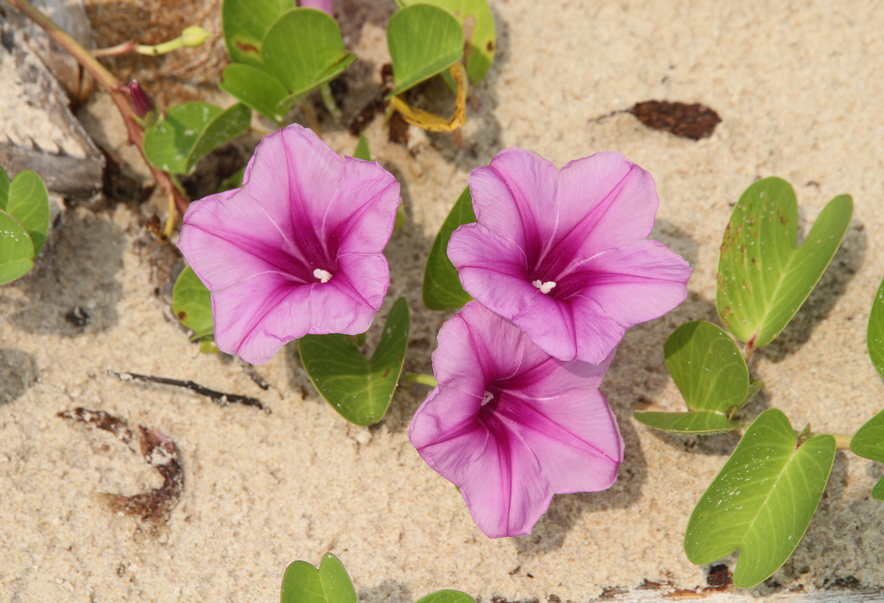 典型的海岛海岸带植物,沙滩上、岩岸缝、珊瑚礁、水岸边及红树林边缘经常能见到其身影,在沙地上喜欢和海边月见草(Oenothera drummondii)结伴出行。在海滨地区其他植物无法生长的贫瘠之地,只要有马鞍藤的种子落地发芽,就可以期待一片绿意出现,具有抗风、耐旱、耐贫瘠、耐沙埋、耐盐碱等特点,是海滩后滨沙地绿化、生态修复的首席代表。