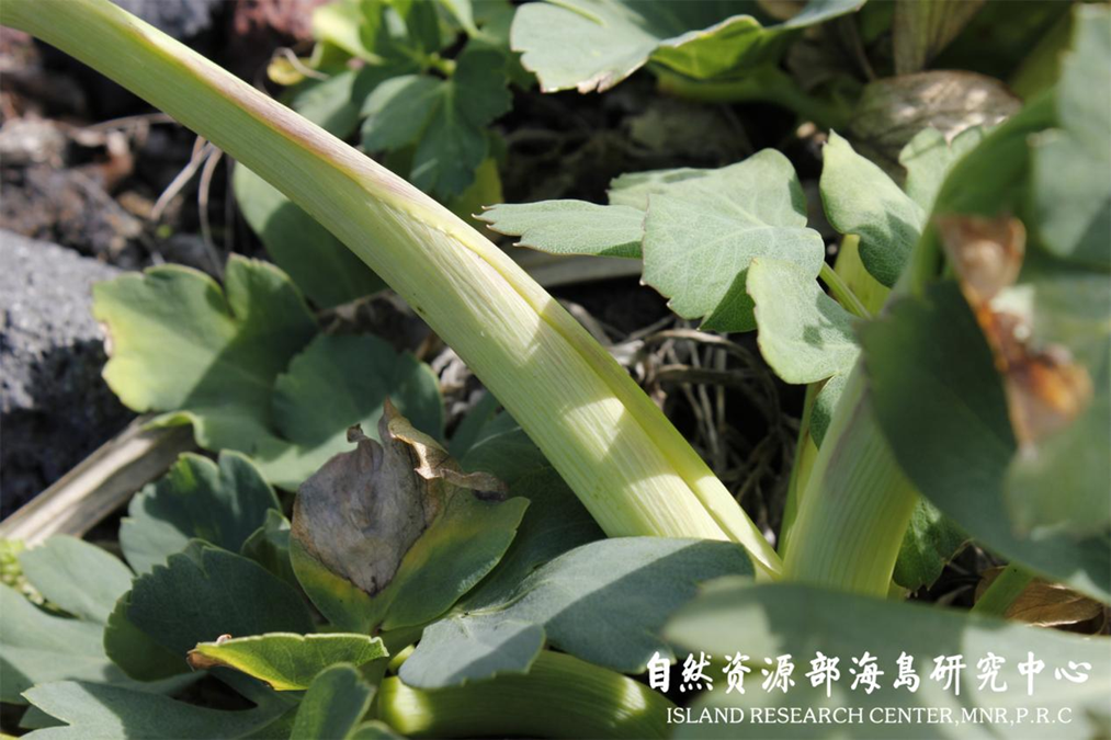 叶片宽大质厚,轮廓为阔卵状三角形,一至二回三出式分裂,最终裂片呈披针形或线状披针形,边缘有锯齿。两面光滑无毛,粉绿色,网状脉细致而清晰。表面有一层薄薄的蜡质层,不仅能减少水分蒸发,抵御海风的侵蚀,还能反射强烈的阳光,保护植株免受灼伤。