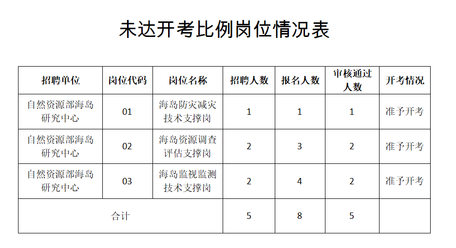 自然资源部海岛研究心2024年公开招聘事业单位人员共有3个岗位(招聘5人)报名人数未达到规定比例(1:3)要求,该类岗位具体报名情况详见附件。经中心招聘领导小组研究,并报平潭综合实验区党工委党群工作部审批同意降低开考比例,现将报名人数未达到规定比例岗位开考情况公告如下: