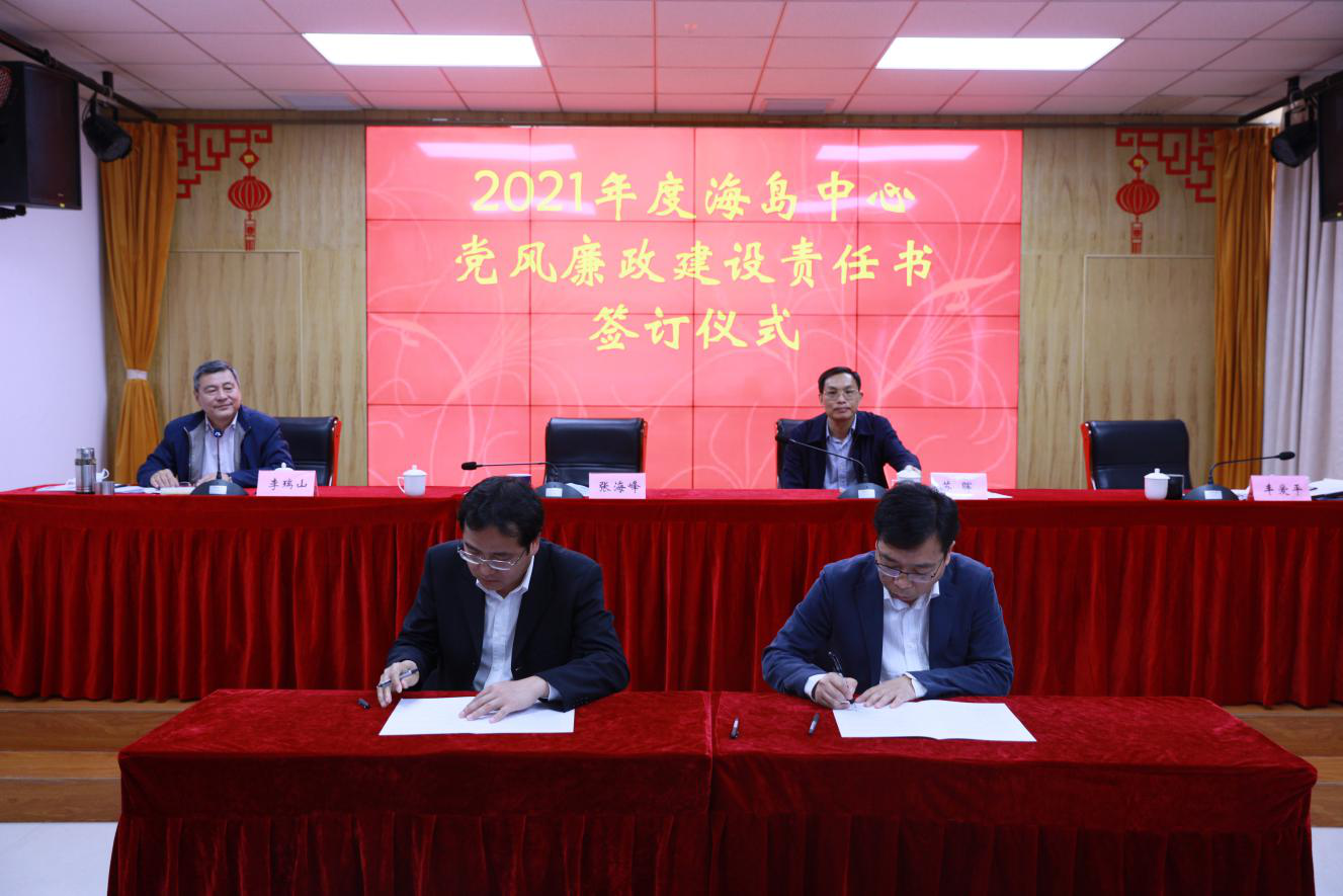 会上,中心举行了2021年度海岛中心党风廉政建设责任书签订仪式。中心党委书记与党委班子成员签订《党风廉政建设“一岗双责”责任书》,中心党委班子和党风廉政建设主体责任联系部门、党支部负责人签订《党风廉政建设责任书》。通过签订责任书,进一步提高中心党风廉政建设工作水平,营造党风正、政风清、作风新的良好氛围。