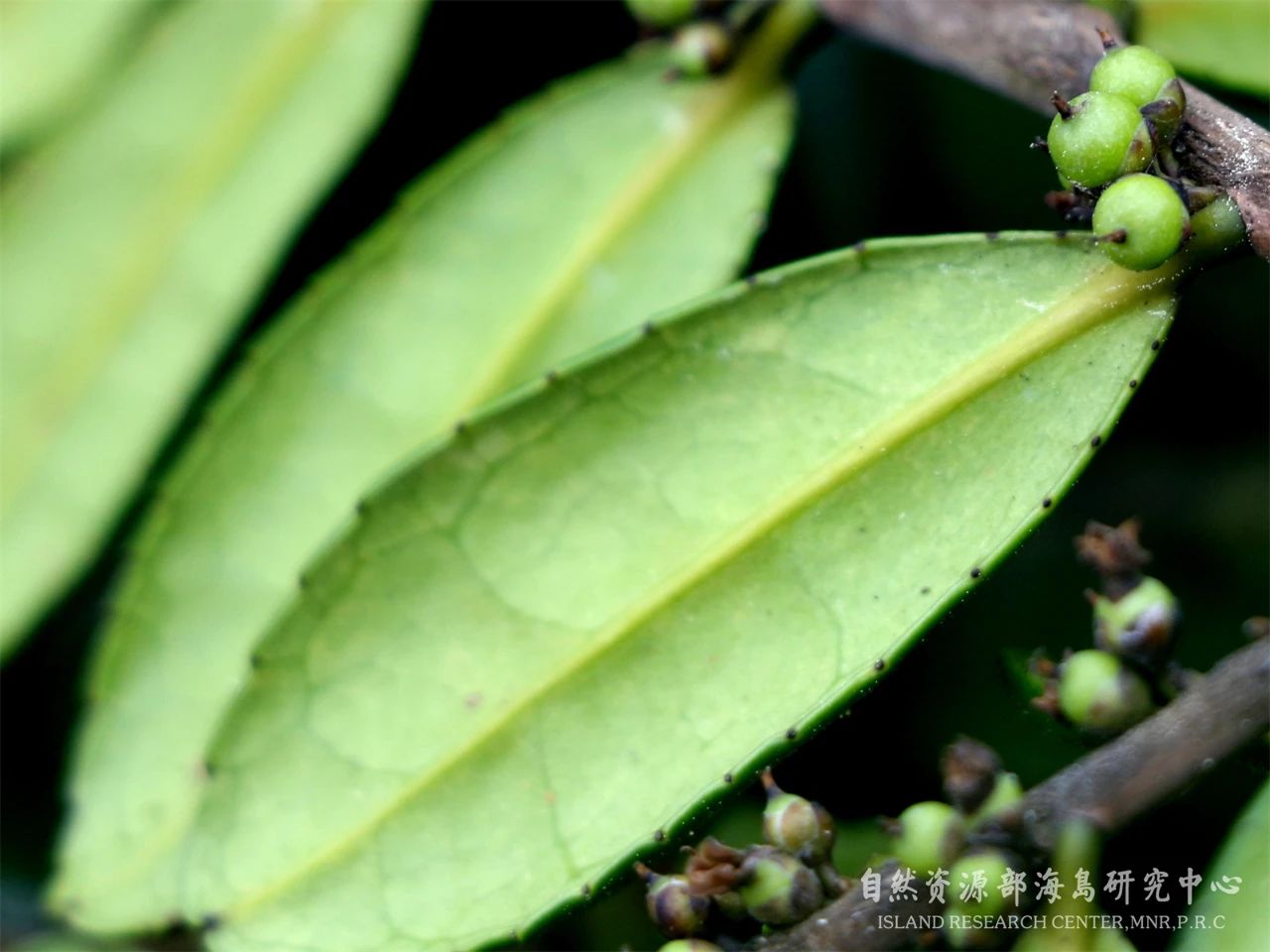叶片上面绿色或深绿色,稍有光泽,透着勃勃生机,下面黄绿色或淡绿色,两面均无毛,中脉在上面凹下,下面隆起,因此,又称“凹叶柃木”。这些叶片就像滨柃的绿色旗帜,在海风中猎猎作响,展示着它不屈的生命力。
