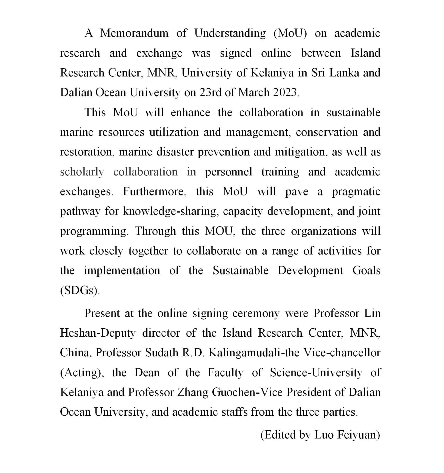 Island Research Center Signs a Tripartite MoU with University of Kelaniya and Dalian Ocean University